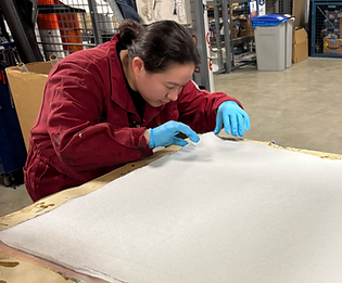 Pictured above and below is the tip-to-tip dry hand layup process, where three layers of carbon fiber are placed on each side to provide additional stiffness to the structure. After each layup, the fincan is vacuum bagged so the layup occurs under compression.
