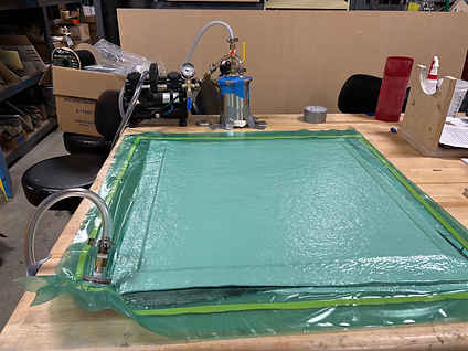 Seen above, there is an image of members conducting a dry hand layup per my instructions with the developed system. This process involved a hollow steel tube being coated in partall paste, sprayed with graphite lubricant, placed on a jig for easy handling, and wrapped in mylar for mold release after layup. Seen on the right, there is an image of me preparing materials (also seen below) for fabricating the blank for our fins, which involves laying up two layers of carbon fiber on either side of a G12 fiberglass sheet, then vacuum bagging so the layup cures under compression (see below to the right).